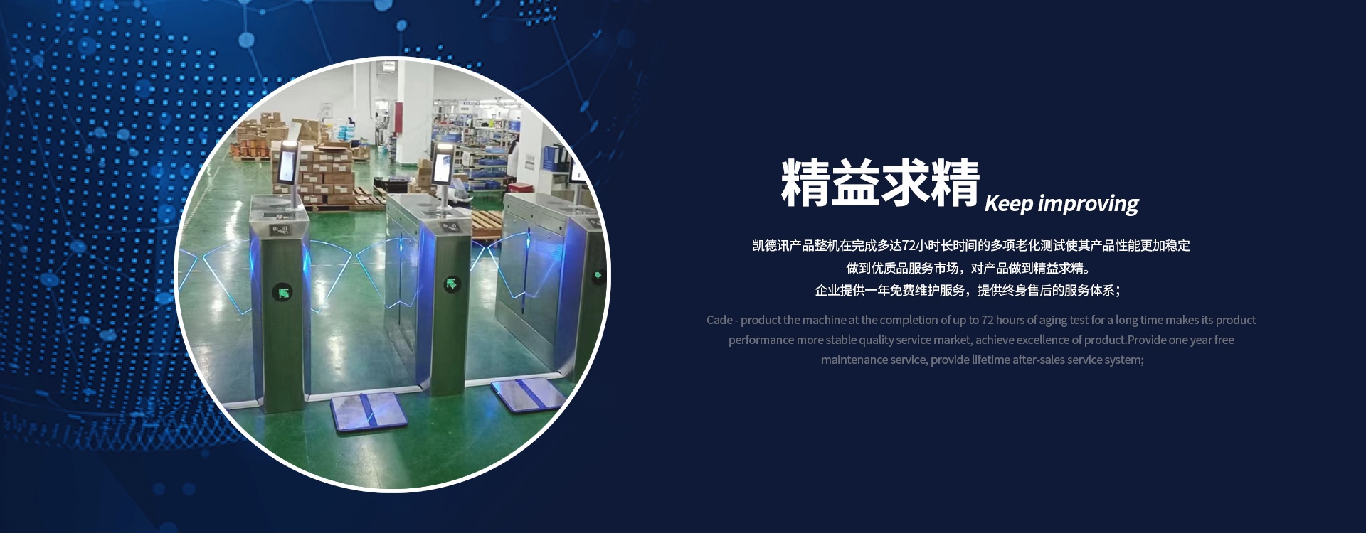 深圳市凱德訊科技有限公司成立于2003年,注冊資本500萬元,位于港珠澳大灣區的深圳市,公司集研發、生產、銷售電子行業防靜電門禁系統和民用智能通道系統的綜合性企業。公司擁有自主產權的產品并一直致力于ESD門禁系統、智能安防門禁系統、景區通道閘機、人臉識別閘機、消費系統、智能翼閘的研發生產與銷售。凱德訊目前擁有多款功能齊全的系統軟件及多款硬件產品,包含成型加工、機芯研發、軟件開發等技術均為本公司自主研發、獨立完成。14年來,凱德訊一直秉承以用戶需求為核心,穩定、實用、智能的產品是我們開拓市場的基石,務實進取的精神是我們孜孜不倦的追求,全方位真誠的服務是我們對您永恒的承諾。